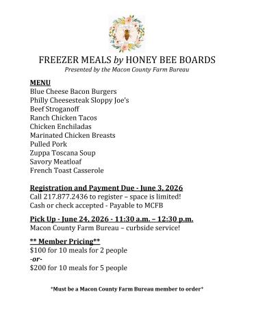 Freezer meals for summer are now available! Simply call 217.877.2436 to place your order today. Funds raised benefit the Macon County Farm Bureau Foundation.